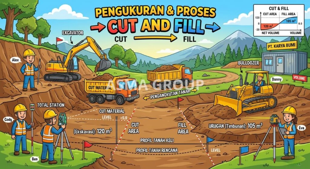 Tahap pertama dalam pekerjaan cut and fill dimulai dari pengukuran topografi. Surveyor mengumpulkan data elevasi, kontur tanah, serta batas area menggunakan alat seperti GPS geodetik atau theodolite. Dengan data ini, tim dapat memahami kondisi asli lahan yang biasanya tidak rata dan memiliki perbedaan ketinggian.